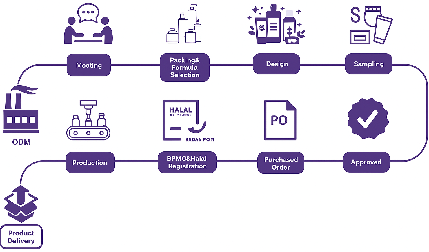 We keep the process straightforward: define the target, develop samples, lock formula + packaging, then move into production with clear QC checkpoints. Steps like local registration are only included when needed for your market.